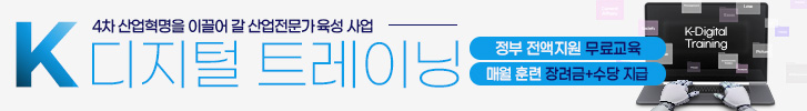 본 과정은 K-디지털 트레이닝 훈련 과정으로 (이하 K-디지털 훈련) K-디지털 훈련이란 AI, 빅데이터 등 디지털·신기술 분야에서 다양하게 활용되는 기반기술, 그리고 이를 활용한 핀테크, 스마트제조 등의 응용기술을 배울 수 있도록 다양한 훈련과정을 제공하는 직업훈련 과정입니다. 본 원에서의 모든 K-디지털 훈련 과정은 수강료 및 교재비에 대해 전액 무료로 수강하실 수 있으며, 매월 훈련장려금을 지원해 드립니다.